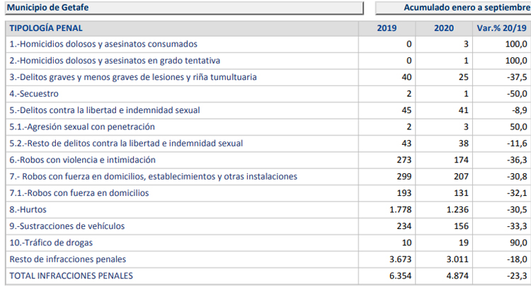 En su conjunto, Getafe ha registrado en los nueve primeros meses de 2020 un total de 4.874 infracciones penales, por las 6.354 del mismo periodo de 2019.